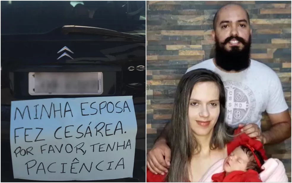 Pai chama atenção no trânsito ao colocar cartaz em carro para pedir paciência por dirigir devagar: ‘Minha esposa fez cesárea’