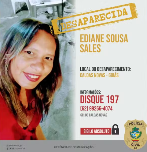 Ediane Sousa Sales, de 35 anos, está desaparecida desde o dia 13 de janeiro, em Caldas Novas, Goiás. Segundo a Polícia Civil, a mulher foi vista pela última vez em um pesque-pague localizado no Setor Mansões, em uma área que dá acesso a um córrego. Buscas e investigações O desaparecimento foi informado às autoridades quatro […]