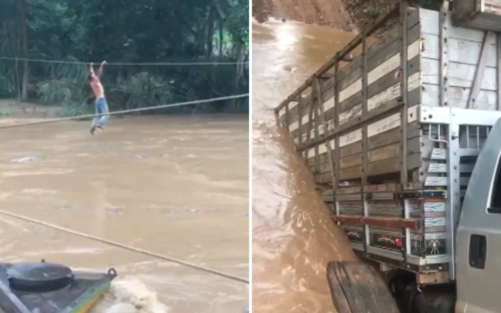Homem se pendura em cabos para ajudar motorista e impedir que caminhão afundasse em rio