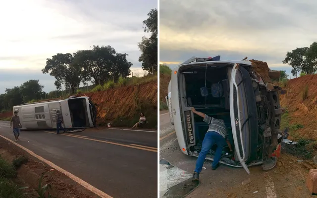 Micro-ônibus que levava alunos para faculdade tomba e deixa seis feridos em rodovia de Goiás