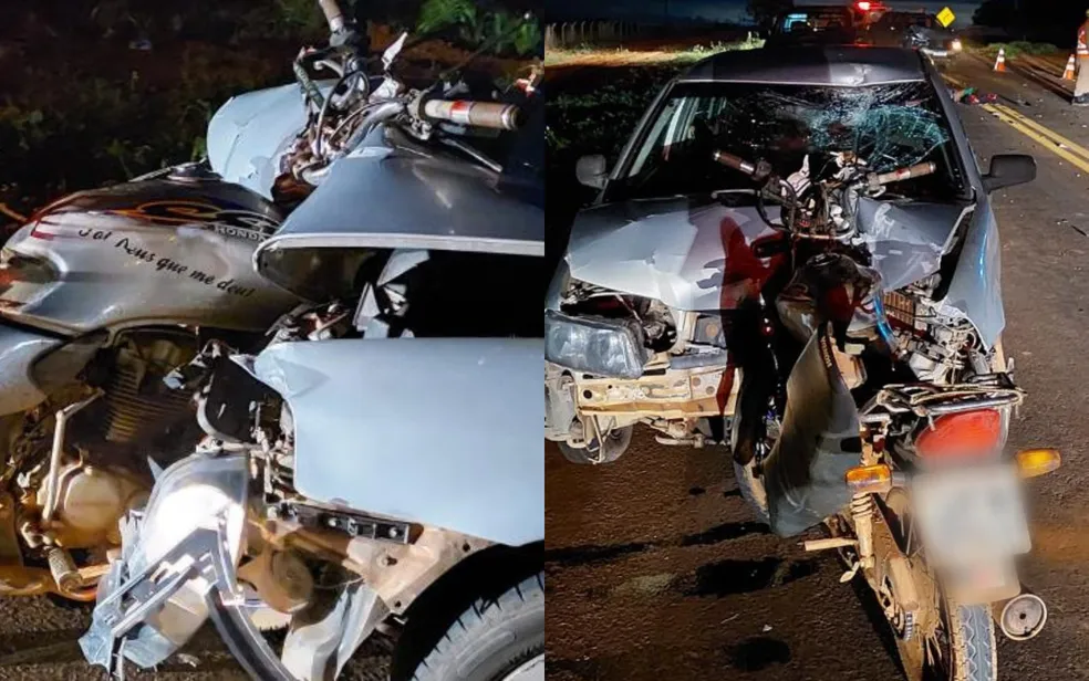 Motociclista morre após bater contra carro e moto ficar presa na frente do veículo, na GO-010