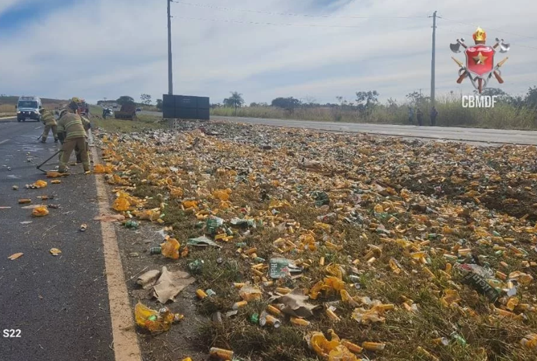 Caminhão tomba e derruba carga de cerveja na BR-020