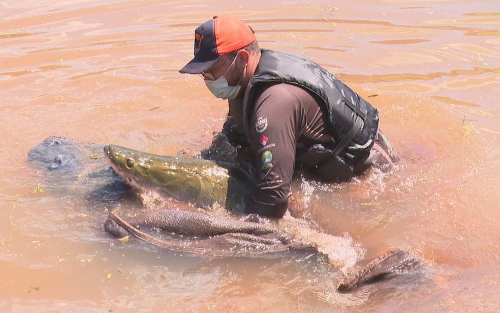 Força-tarefa retira pirarucu de quase 2 metros de lago após 2h