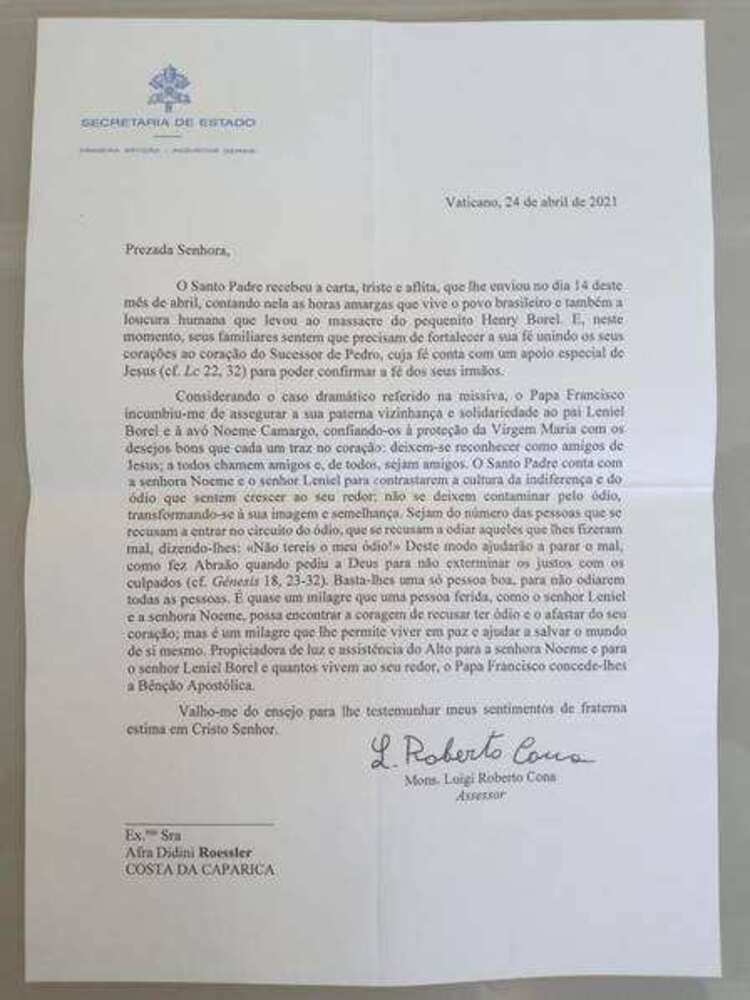 Solidariedade; PAPA Francisco envia carta para brasileiro