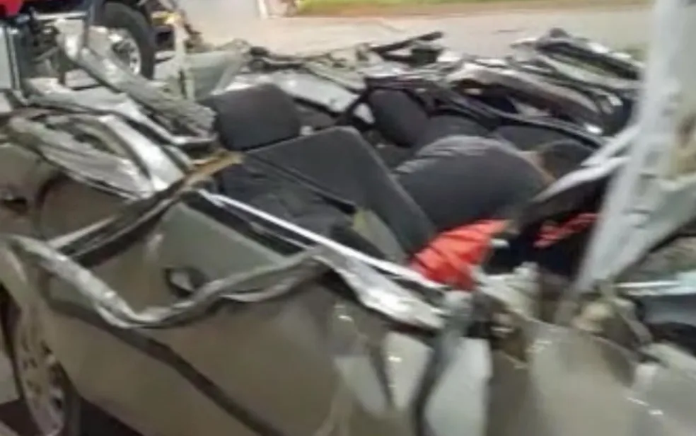 Pelas imagens, é possível ver que o teto e o capô do carro das vítimas ficaram destruídos. O teto, inclusive, foi totalmente arrancado.