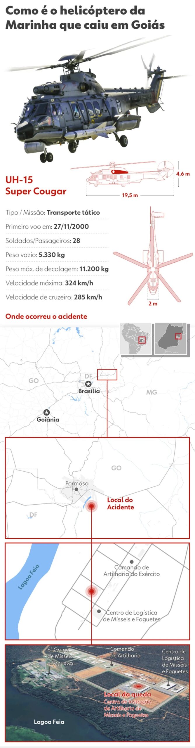 O helicóptero UH-15, “Super Cougar”, da Marinha, que caiu em Formosa, no Entorno do Distrito Federal, é uma aeronave com capacidade de transportar até 28 militares, além de ser utilizado em operações especiais e desastres naturais.