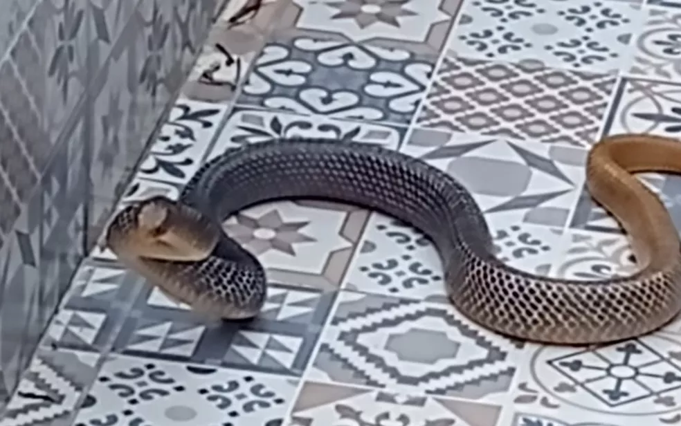 Segundo ela, o animal selvagem parecia bravo, mas como mora em uma fazenda já está acostumada a ver bichos assim. Já os cachorros, que são da raça pinscher, ficaram bem agitados com a “visita” da cobra.