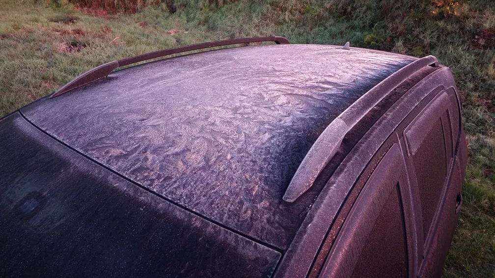 A formação de geada também chegou a cobrir um carro que estava estacionado na rua durante a noite. Um vídeo feito pelo morador Mycchel Legnaghi mostra o gelo “peluciado” sobre o capô do veículo.