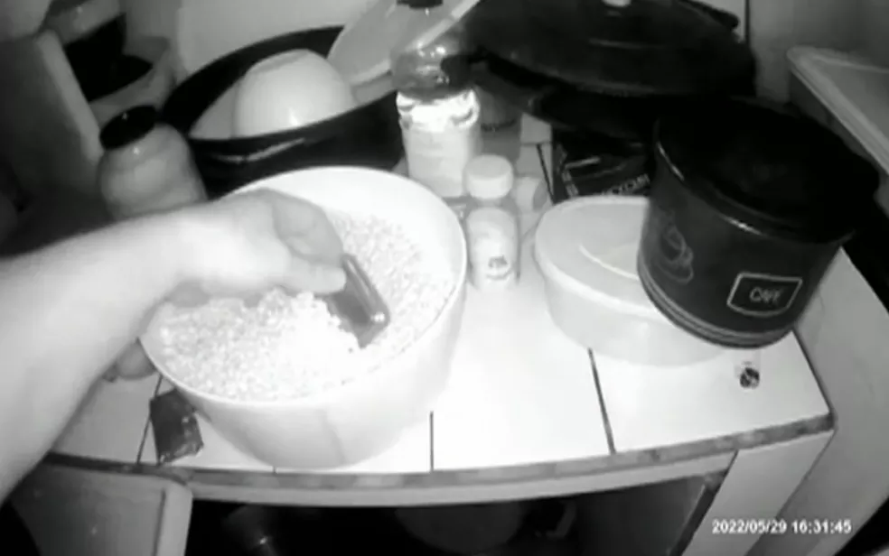 Gravação também mostra quando PM encontrou balança de precisão dentro de pote de arroz. Mulher, que teve filho preso dias antes, foi detida junto com genro e nora.